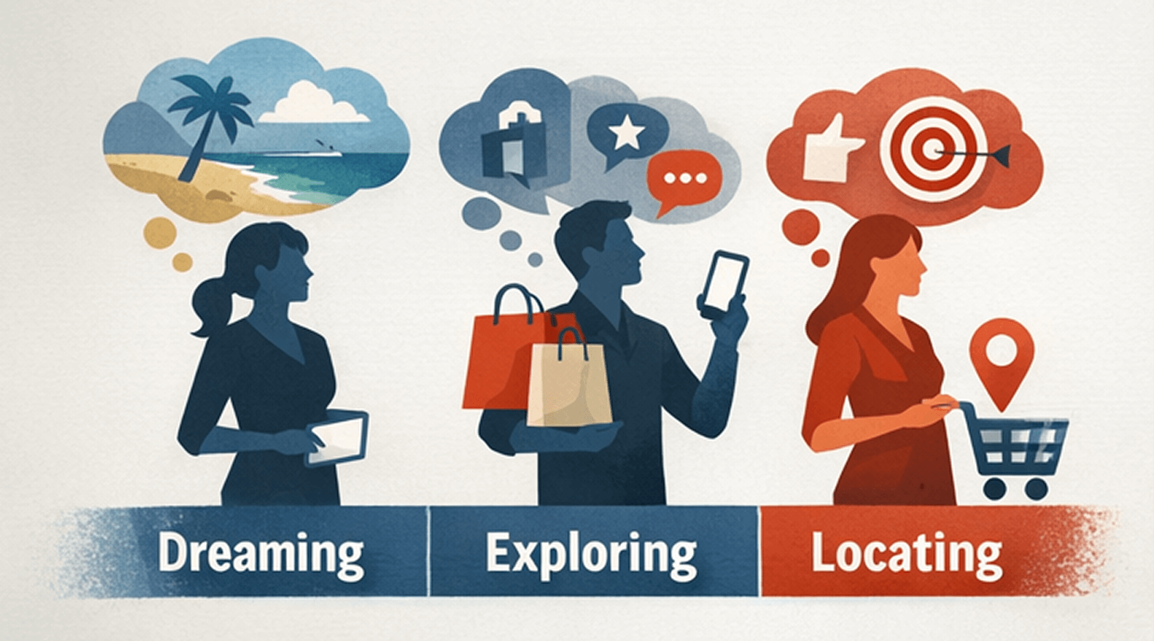 Первая модель — сегментация по стадии принятия решения: Dreaming, Exploring, Locating. На стадии Dreaming потребитель ещё не осознаёт потребность — он мечтает, вдохновляется, формирует образ желаемого. На стадии Exploring он уже понимает, чего хочет, и изучает варианты — сравнивает, читает отзывы, примеряет на себя. На стадии Locating решение принято, осталось найти, где купить и по какой цене. Каждая стадия требует разного сообщения, разного канала, разного формата контента. Реклама, которая работает на Locating, бесполезна для Dreaming — и наоборот.