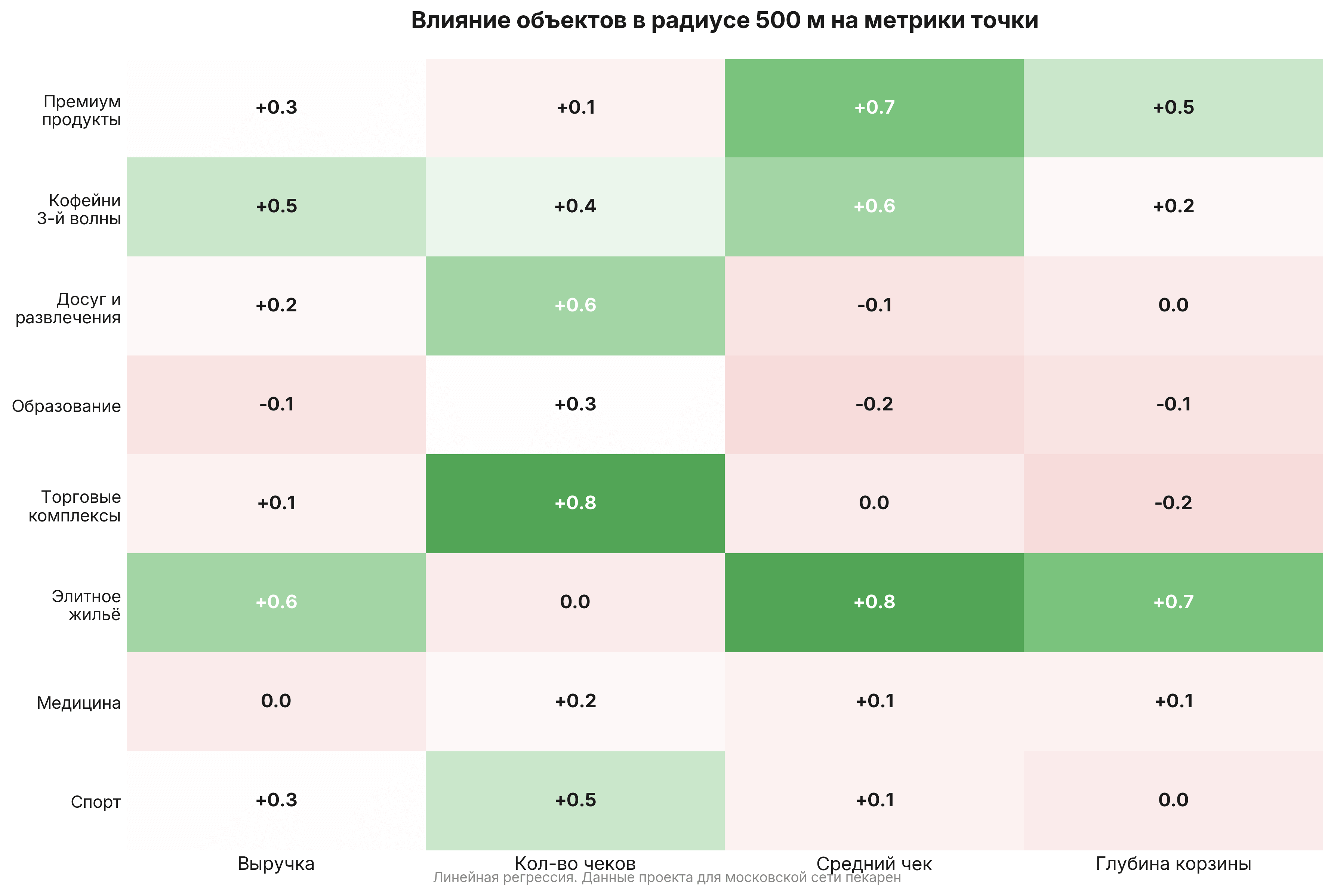Объекты вокруг точки формируют профиль проходящего потока: кто проходит мимо, с каким запросом, в какое время суток. Оператор обычно оценивает локацию по трафику и видимости, но одна и та же проходимость генерирует разный спрос в зависимости от того, что рядом: бизнес-центр, продуктовый рынок или жильё бизнес-класса. Если связать состав окружения с кассовыми данными существующих точек, потенциал площадки можно оценить количественно — до подписания договора аренды.