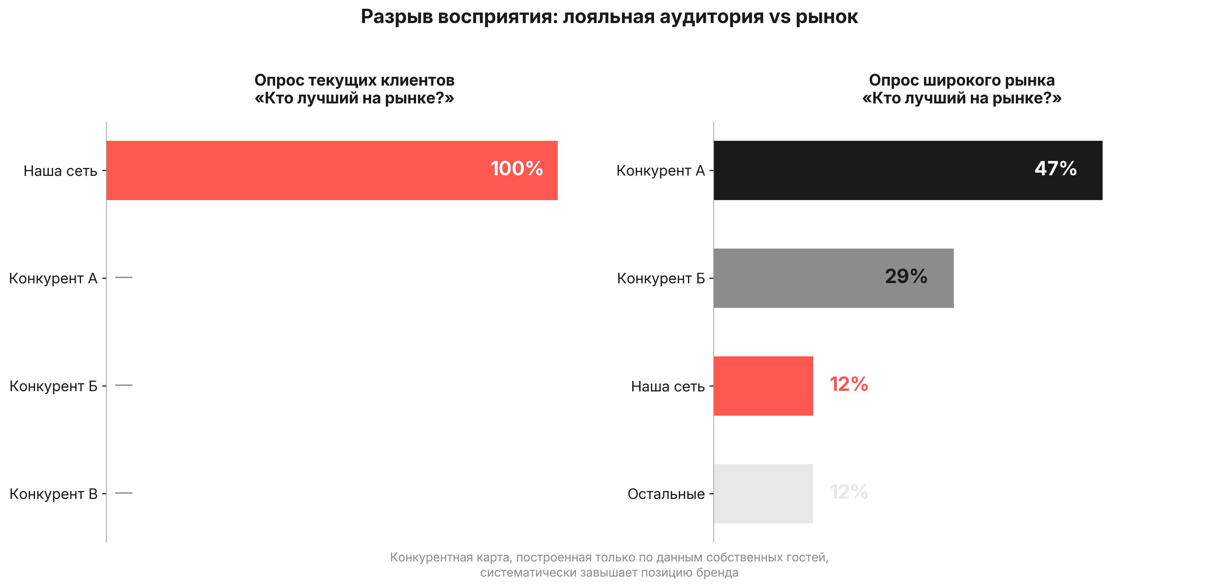 Но ключевым оказался разрыв в восприятии бренда. Текущие клиенты оценивали свою сеть как лучшую на рынке — 100% в опросе. Широкий рынок давал другую картину: лучшим называли конкурента А (47%), конкурента Б (29%). Сеть нашего клиента не попадала в тройку. Лояльная аудитория создавала иллюзию сильной рыночной позиции, которой за пределами собственной клиентской базы не существовало. Без внешнего опроса группа продолжала бы оптимизировать предложение под сценарии текущих гостей, тогда как для привлечения широкого рынка требовались другие акценты: иной формат подачи, другая ценовая коммуникация и позиционирование на тех сценариях, где конкуренты А и Б были слабы.