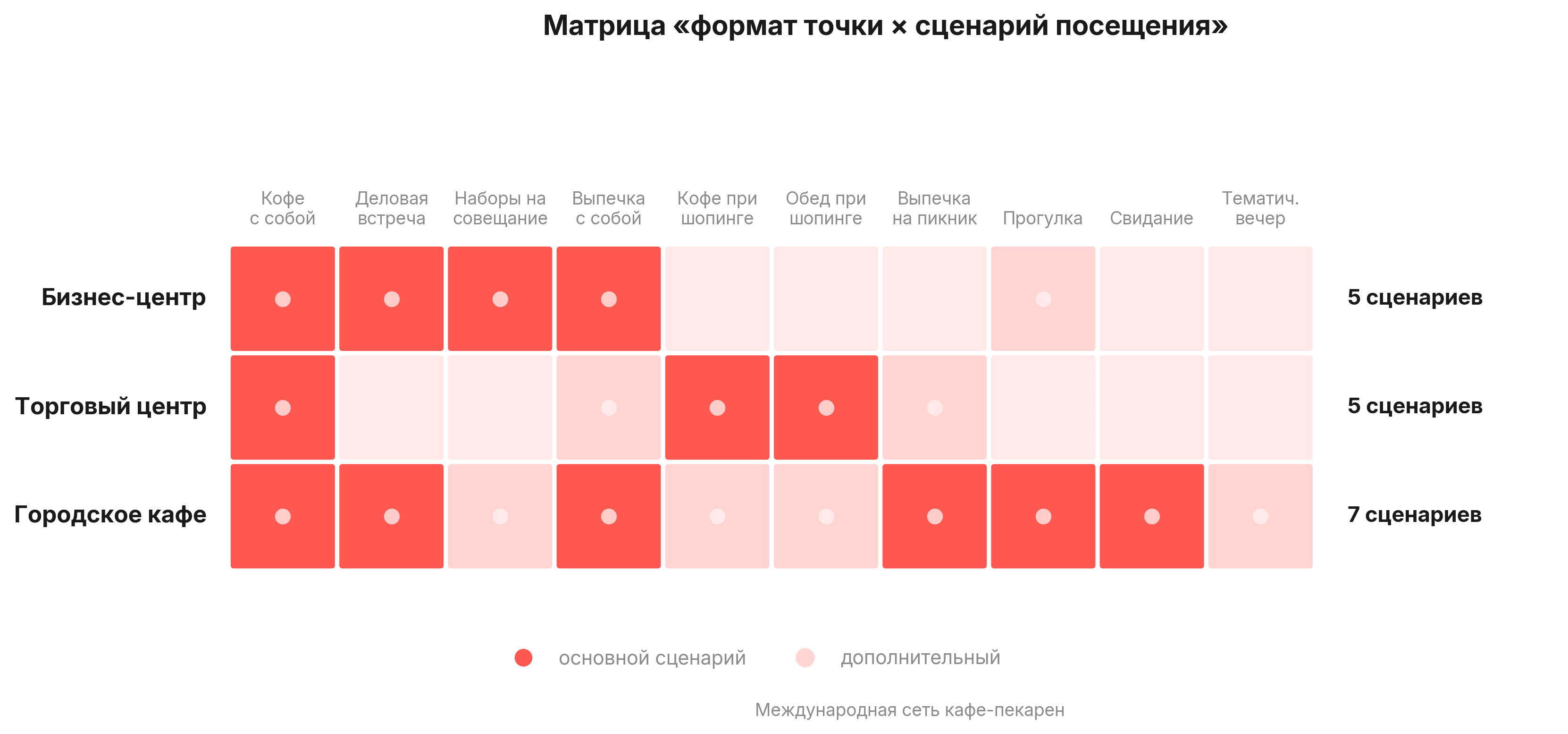Тот же подход работает в других масштабах. Для международной сети кафе-пекарен геоаналитика помогла определить набор сценариев, которые каждый формат точки способен закрыть.