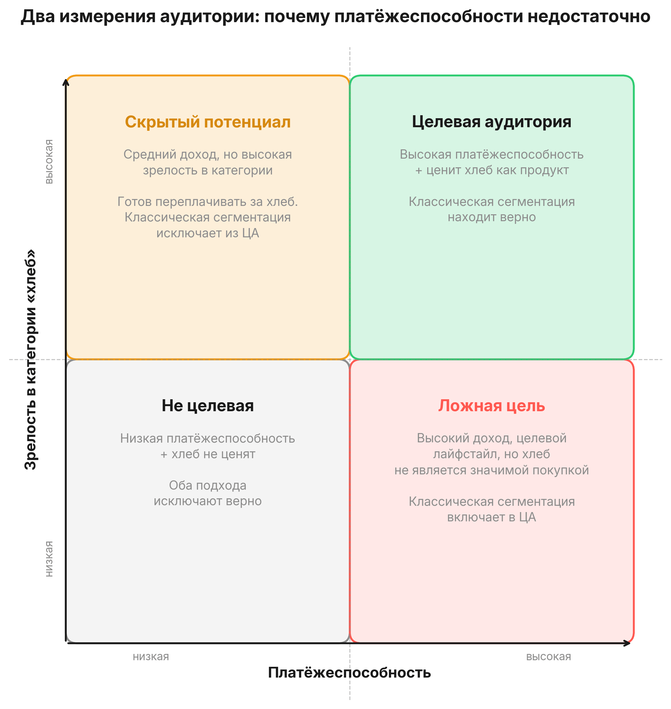 Без этого измерения сегментация давала бы два типа ошибок: включала бы в целевую аудиторию людей, которые не придут (высокий доход, но хлеб не ценят), и исключала бы тех, кто готов платить (средний доход, но высокая зрелость в категории).