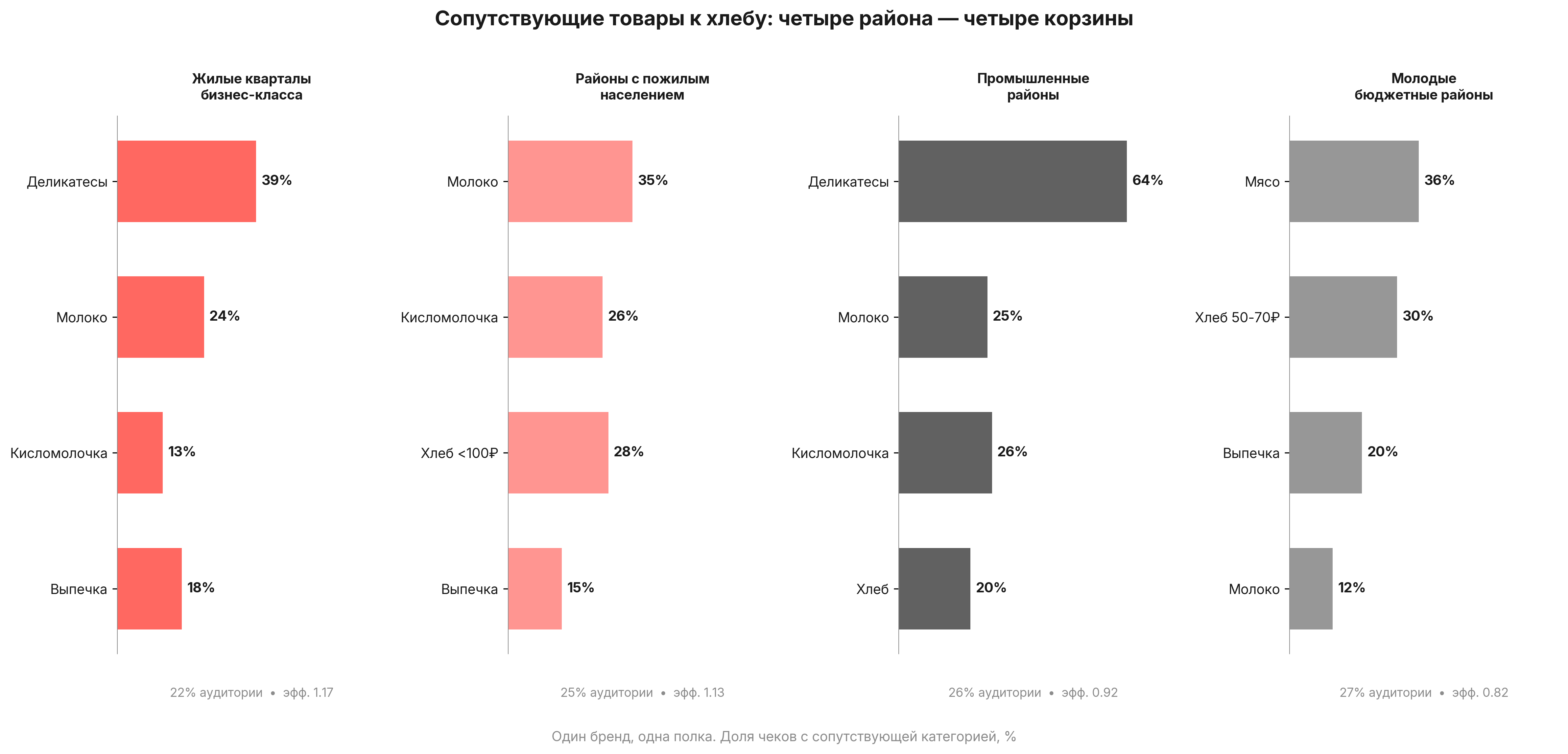 Работая с региональной сетью, мы проанализировали структуру чеков по точкам и обнаружили четыре устойчивых паттерна, привязанных к локации. В точках рядом с жилыми кварталами бизнес-класса сопутствующие категории формировали корзину «гастрономия к столу»: деликатесы (39% чеков), молочная продукция, выпечка. Вблизи промзоны корзина выглядела иначе — деликатесы присутствовали уже в 64% чеков, но в другой роли: рабочие собирали перекус из готовых продуктов. В районах с пожилым населением доминировали бюджетные позиции и кисломолочка. В районах с молодой мужской аудиторией — мясная гастрономия.