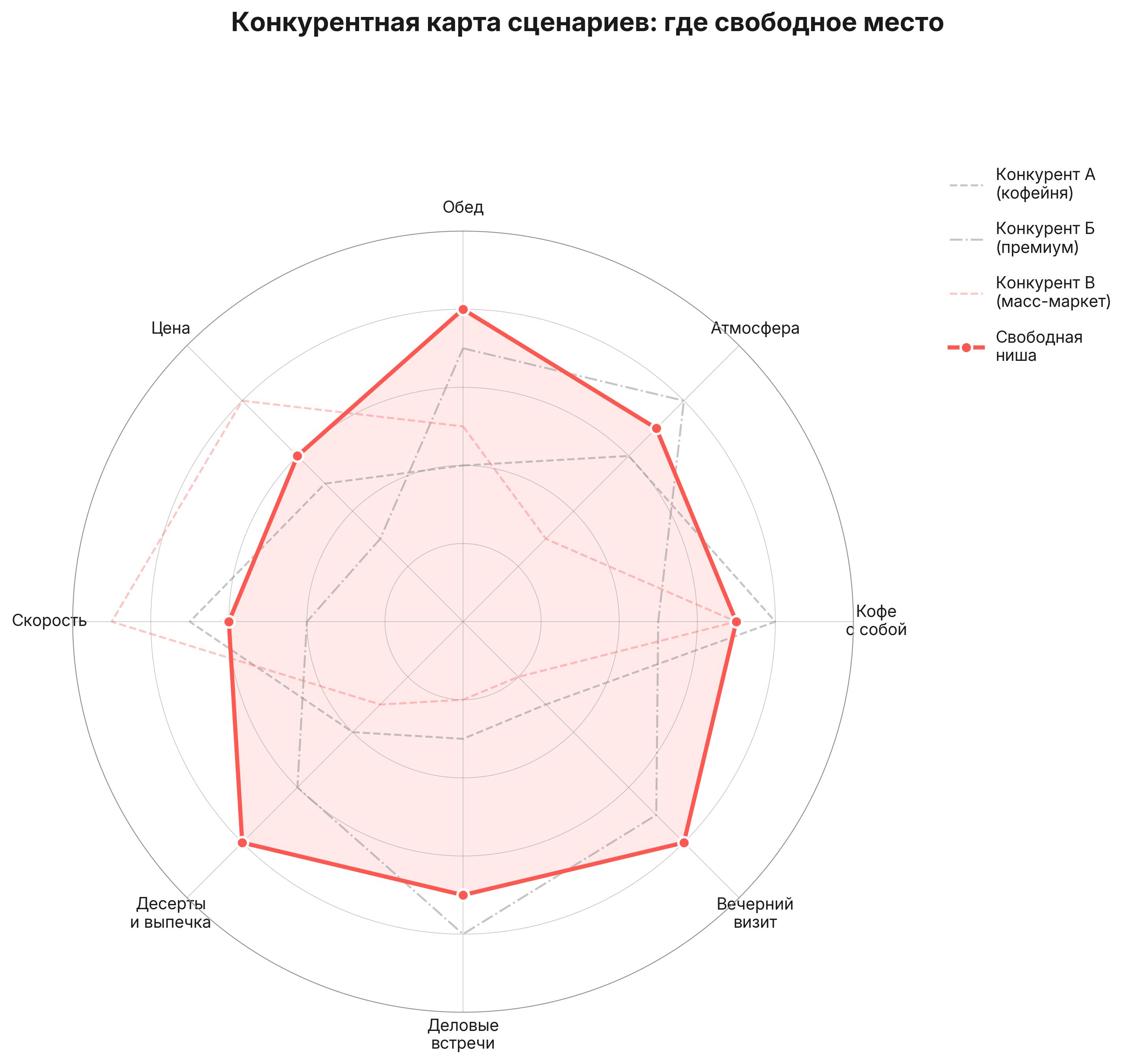 Разрабатывая стратегию выхода на рынок для международной сети кафе-пекарен, мы составили карту мотивов посещения по восьми конкурентам в радиусе локации. Каждый из них занимал понятную позицию: кто-то закрывал «быстрый кофе навынос», кто-то — «посидеть с ноутбуком», кто-то — «обед в среднем сегменте». Но сценарий «пообедать и заодно взять кофе с собой» — комбинация двух мотивов в одном визите — не закрывался никем. По отдельности обед и кофе навынос были представлены, но их пересечение оставалось пустым. Ниша выглядела очевидной постфактум, но была невидима при стандартном анализе по форматам: кофейни не ассоциировались с обедом, обеденные заведения не предлагали качественный кофе навынос. Именно этот сценарий стал основой позиционирования сети на новом для себя рынке.