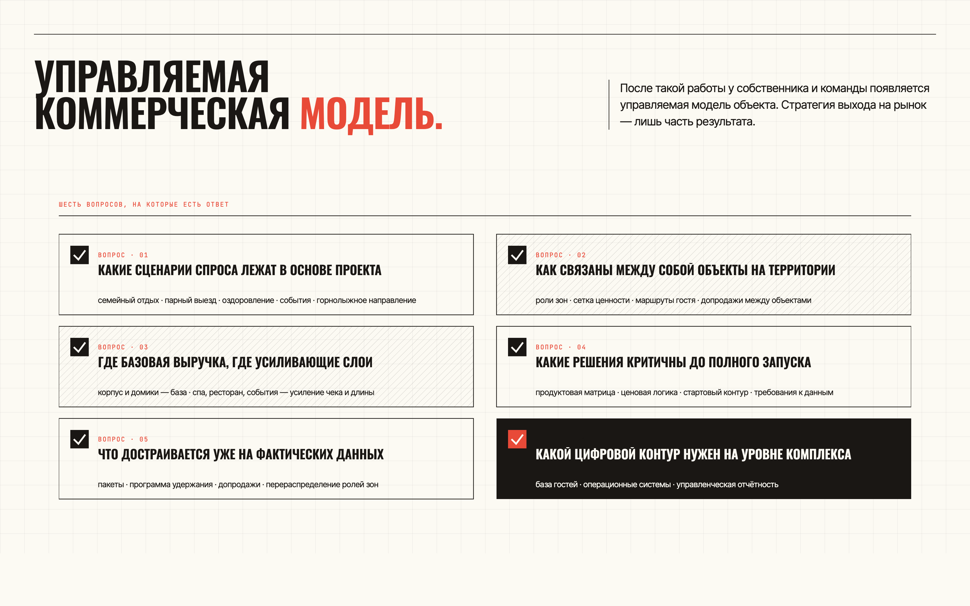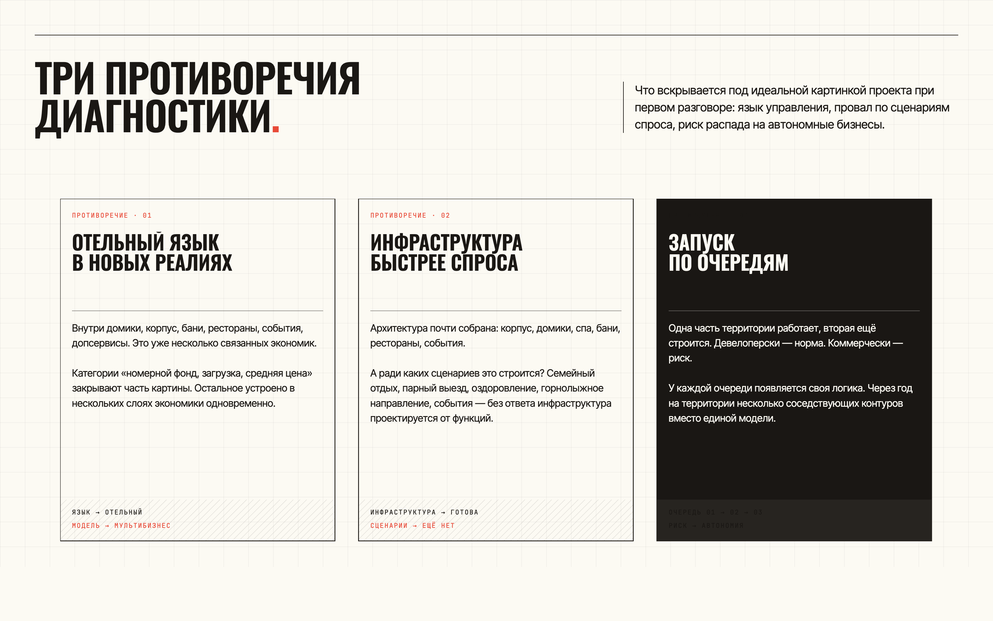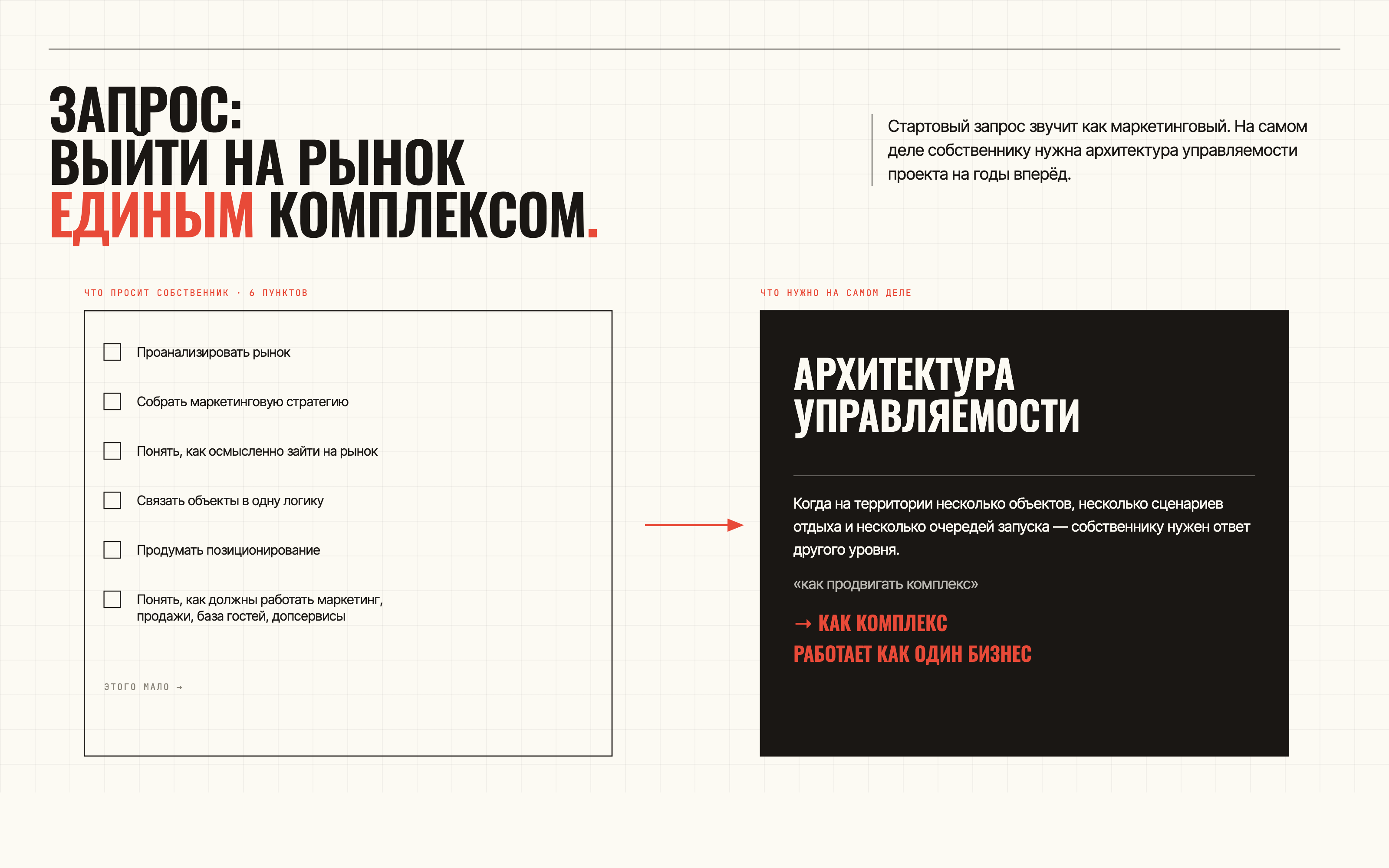 Ниже — материал о том, как мы подходим к таким проектам: что собственник формулирует как запрос, какие противоречия вскрываются на диагностике, что нужно сделать до запуска, что внедряется между очередями и как собрать сложный курортный объект в управляемую модель. Иначе результат — территория с несколькими автономными активами и без общего знаменателя.