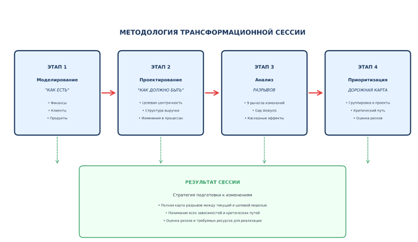 Для компаний, стоящих перед необходимостью радикальных изменений, такая сессия становится важным инструментом, позволяющим понять, готовы ли они к перестройке вообще, и если готовы, то как к ней правильно подступиться.