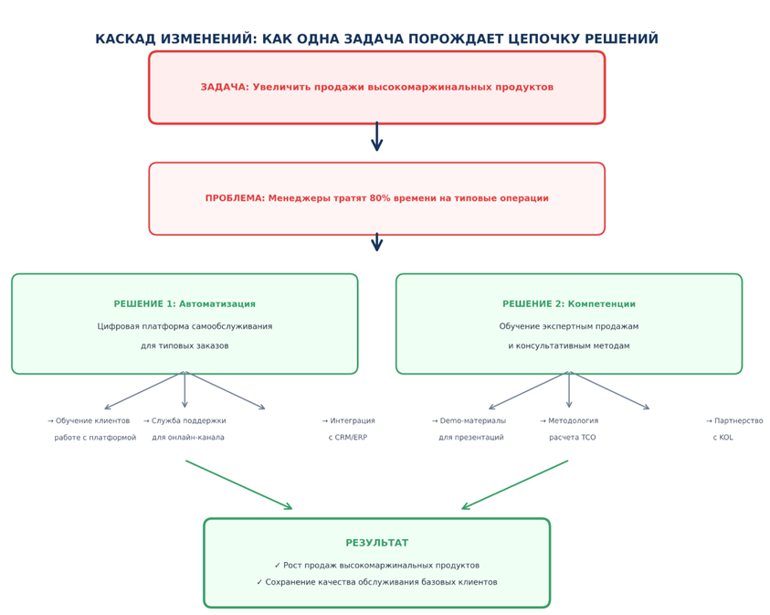 «Вы планируете переориентировать продавцов на сложные продукты. Но кто тогда будет обслуживать текущий поток типовых заказов? Если эти заказы продолжат обрабатываться вручную, откуда возьмется время на новые продукты?»