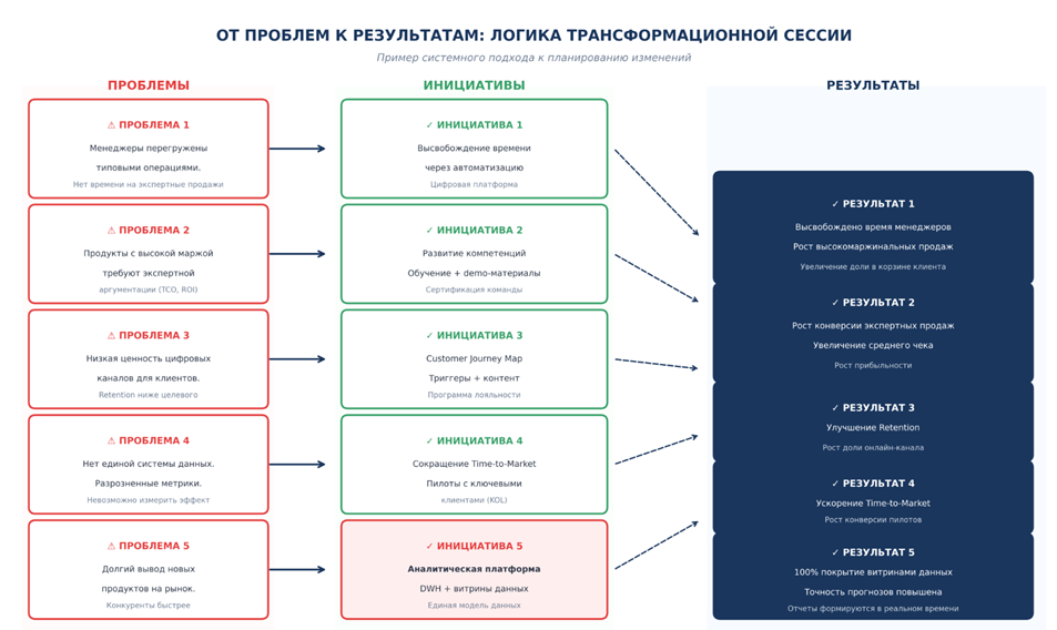 Трансформационная сессия не гарантирует, что этих проблем не возникнет. Но она делает их видимыми ДО начала реализации, когда еще есть возможность скорректировать подход, подготовить команду, обеспечить необходимые ресурсы.