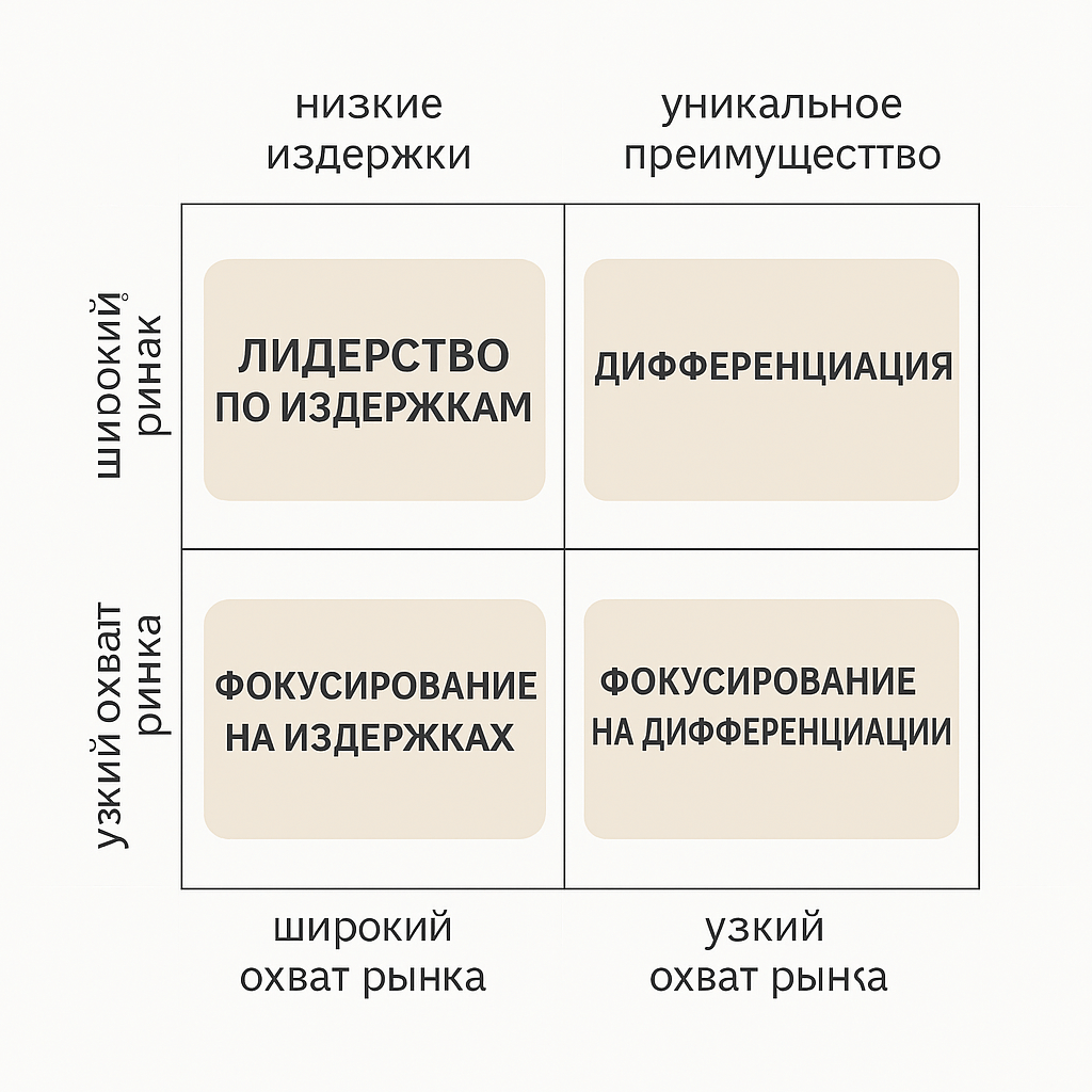 В основе любой такой стратегии лежит создание устойчивого преимущества: такого превосходства над соперниками, которое позволяет компании в течение длительного времени опережать их по ключевым показателям эффективности. Это может быть преимущество в затратах, уникальность продукта, превосходный сервис, сильный бренд или любой другой фактор, ценимый потребителями.