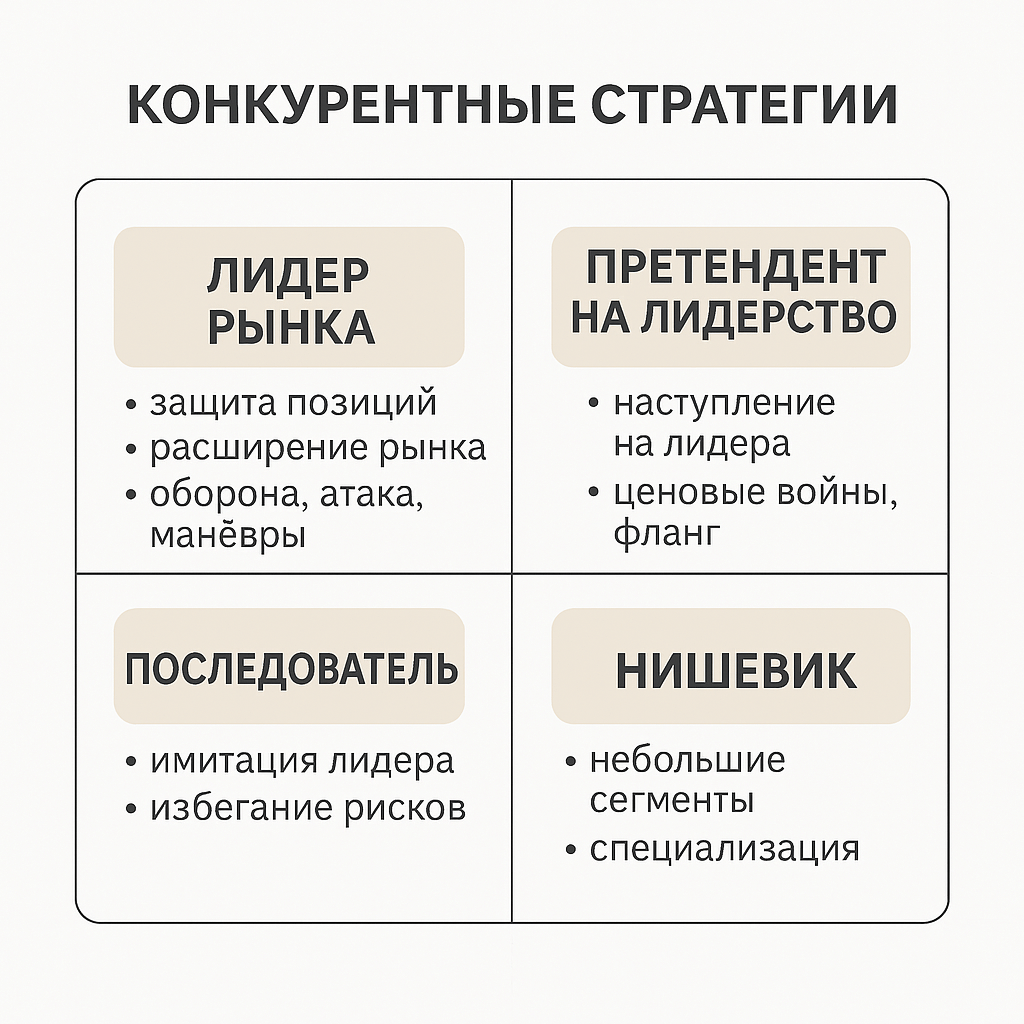 Филипп Котлер предложил классификацию конкурентных стратегий в зависимости от роли компании на целевом рынке. Согласно этой типологии, выделяются четыре основных типа игроков, каждому из которых соответствует особый стиль конкурентного поведения.